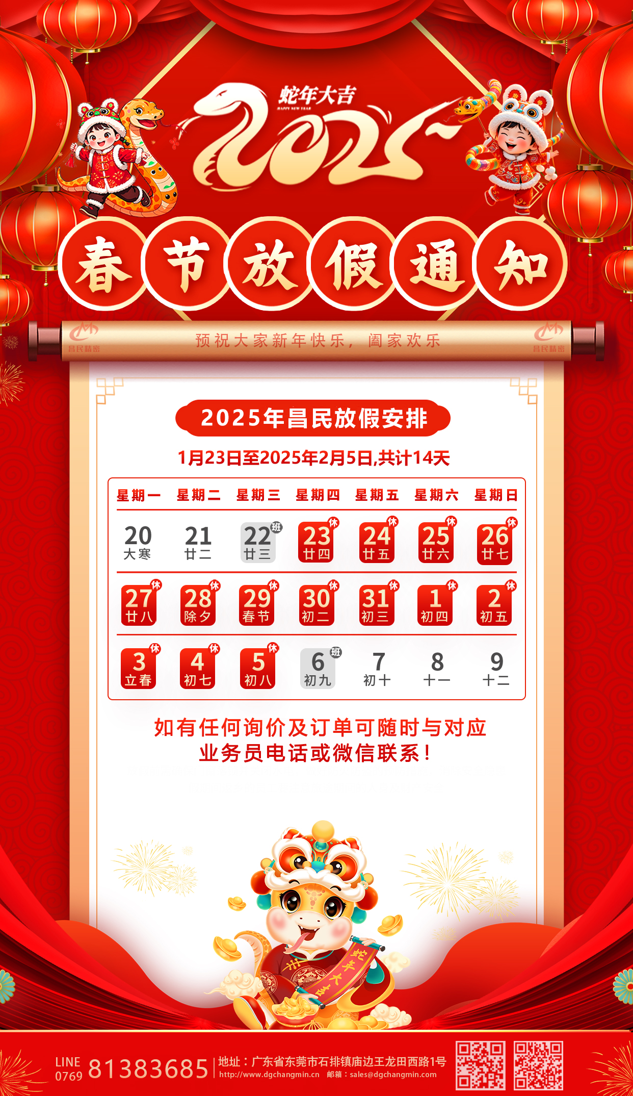 值此新春佳节来临之际,为让大家拥有一个快乐而充实的春节,根据国家相关规定并结合我司实际情况放假通知安排如下:1月23日至2025年2月5日,共计14天,2025年2月6日开工正式上班。期间,大家可以尽情享受与家人团聚的美好时光,感受浓浓的年味! 在此,星空注册入口_星空中国全体同仁预祝大家新春快乐,阖家幸福,万事如意!最后,再次衷心感谢新老客户在过去一年里的支持与帮助,让我们共同期待2025年,大家一起携手前行,共创辉煌!
